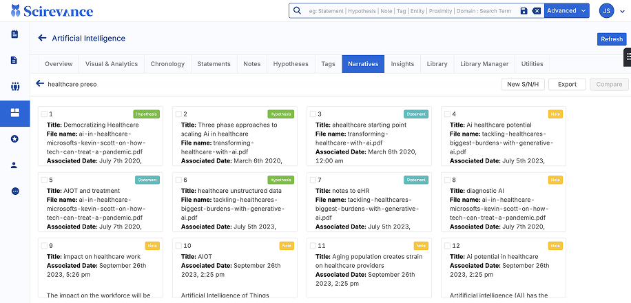 By integrating AI in knowledge management like narrative intelligence, insights using generative AI, and natural language processing (NLP), Scirevance enables real-time analysis and simplifies document management. Also, it empowers users to create comprehensive and successful reports right from the outset.